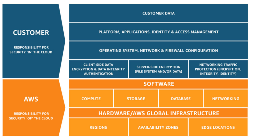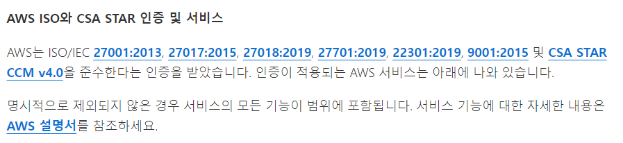 AWS는 이와 관련해 아래와 같이 AWS에서 관리하는 부분과 사용자가 관리해야 하는 부분을 명시하고 있으며, AWS가 관리하는 서비스에 대해 다양한 인증과 보안 패치 등을 수행하고 공시하고 있다.