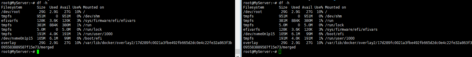 먼저 아무것도 수행하지 않은 상태의 두 개의 쉘을 열어서 df -h결과를 비교한다.