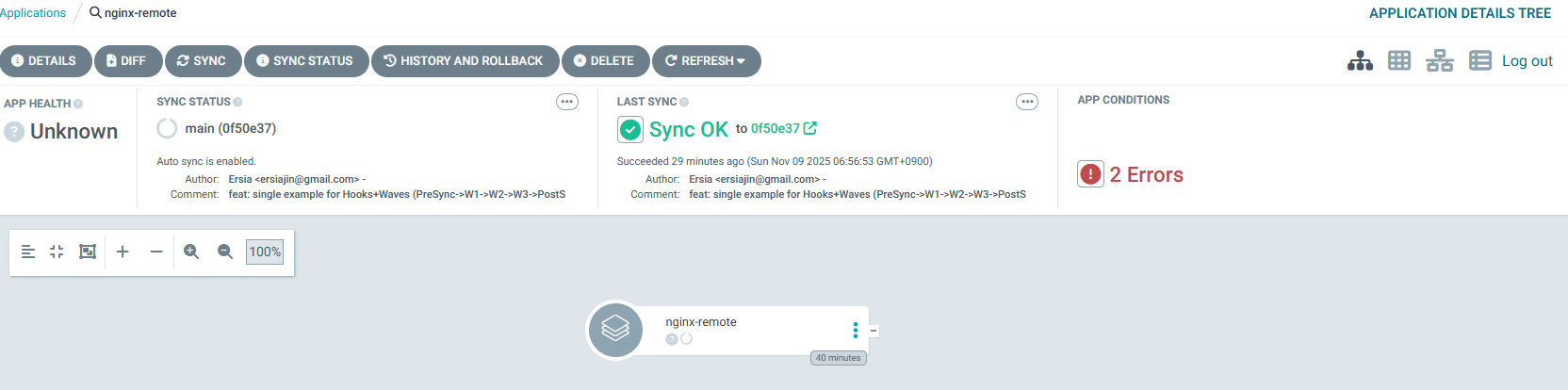 ArgoCD UI에서도 아래와 같이 동기화 에러를 확인할 수 있다.