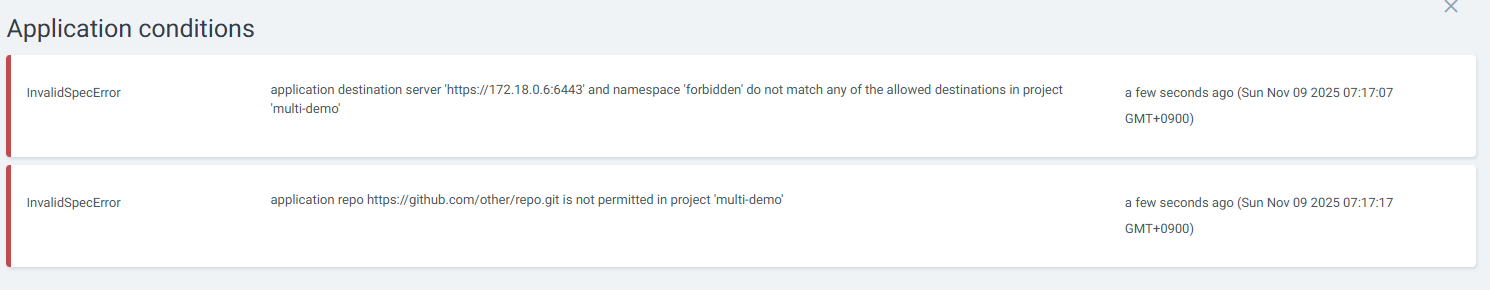 application destination server 'https://172.18.0.6:6443' and namespace 'forbidden' do not match any of the allowed destinations in project 'multi-demo' application repo https://github.com/other/repo.git is not permitted in project 'multi-demo'